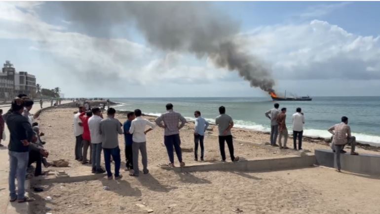 गुजरात के पोरबंदर बंदरगाह पर मालवाहक जहाज में लगी भीषण आग, बचाव कार्य जारी