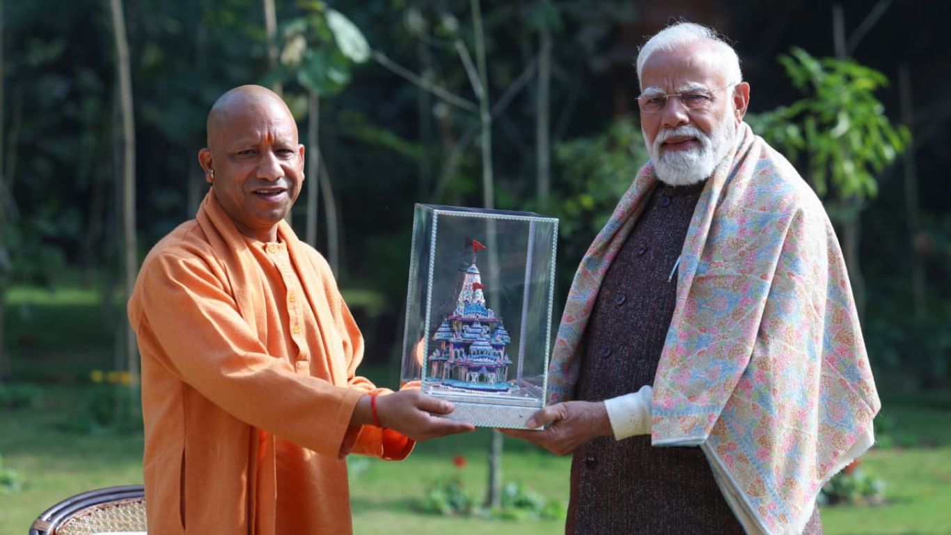सीएम योगी ने पीएम मोदी से की मुलाकात, गुलाबी मीनाकारी की श्रीराम मंदिर अनुकृति भेंट की