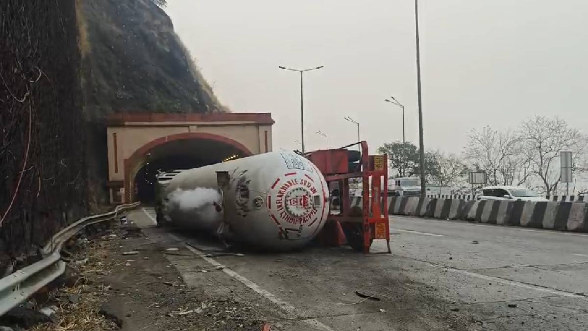 मुंबई-पुणे एक्सप्रेसवे पर गैस टैंकर पलटा, रात भर फंसी रहीं गाड़ियां.