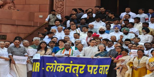 SIR के विरोध में विपक्षी दलों के सांसदों ने संसद भवन परिसर में मार्च किया