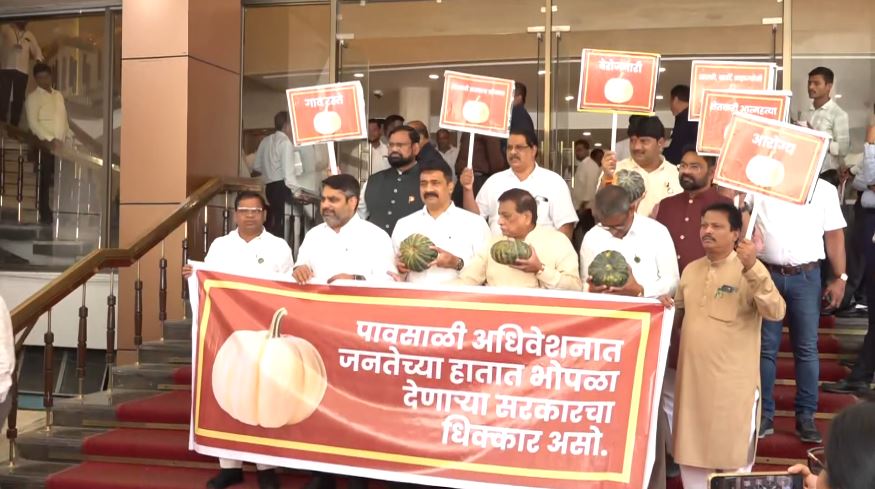 Mumbai: विपक्ष ने 'कद्दू' लेकर विरोध प्रदर्शन किया, कहा- राज्य सरकार ने लोगों के लिए कुछ नहीं किया